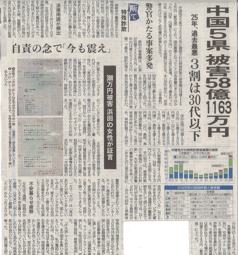 中国地方5県で2025年に確認された特殊詐欺の被害額は58億1,163万円(暫定値)に上り、過去最悪となりました。